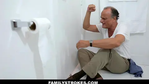Wow this is something you really don’t need after a long day in the Office: your wife locks you up in the toilet and fucks your son in front of the door